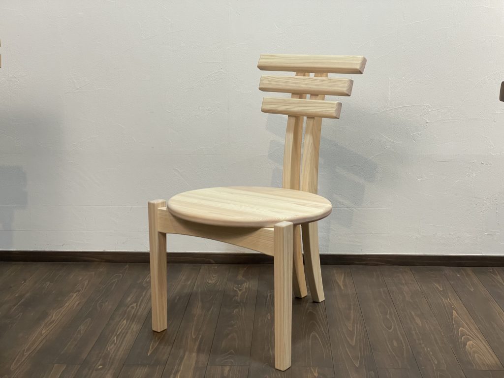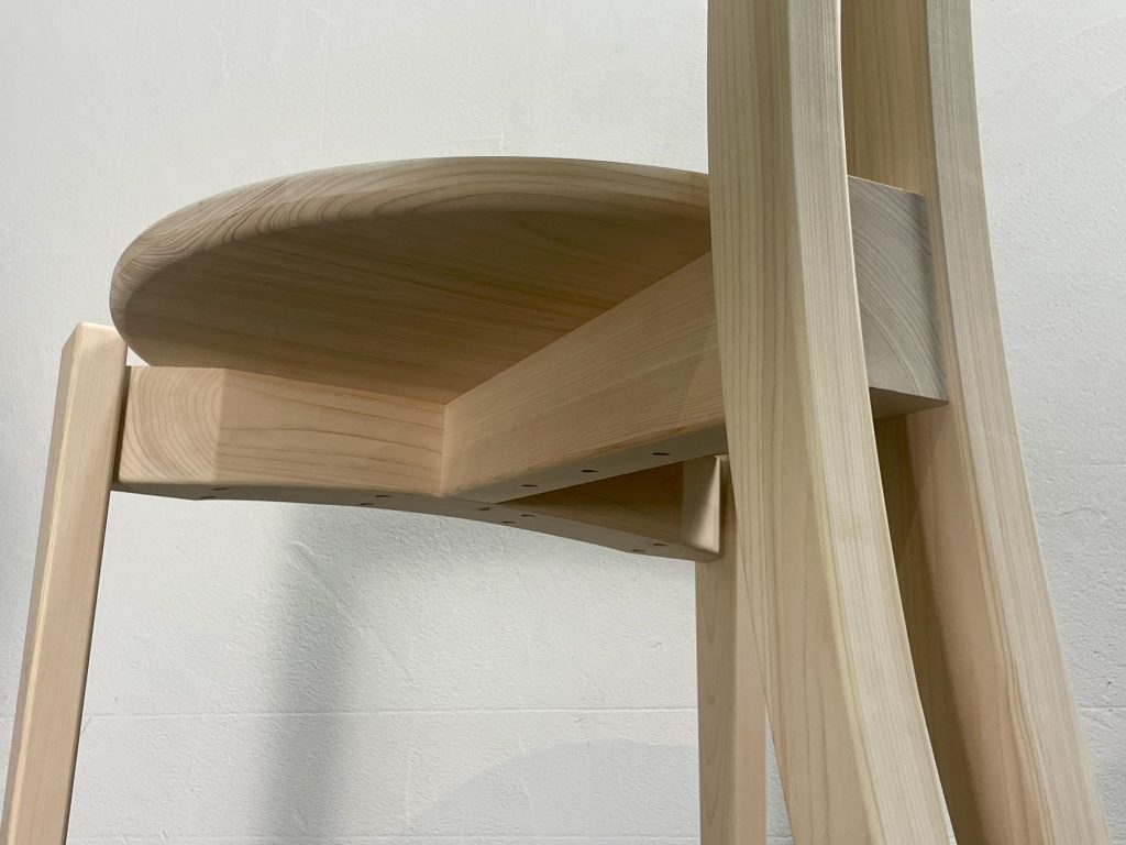 座面の下に通る竜骨のような太い木材が、座る人の体重を支え、椅子の強度の要となり重要な機能を果たす。